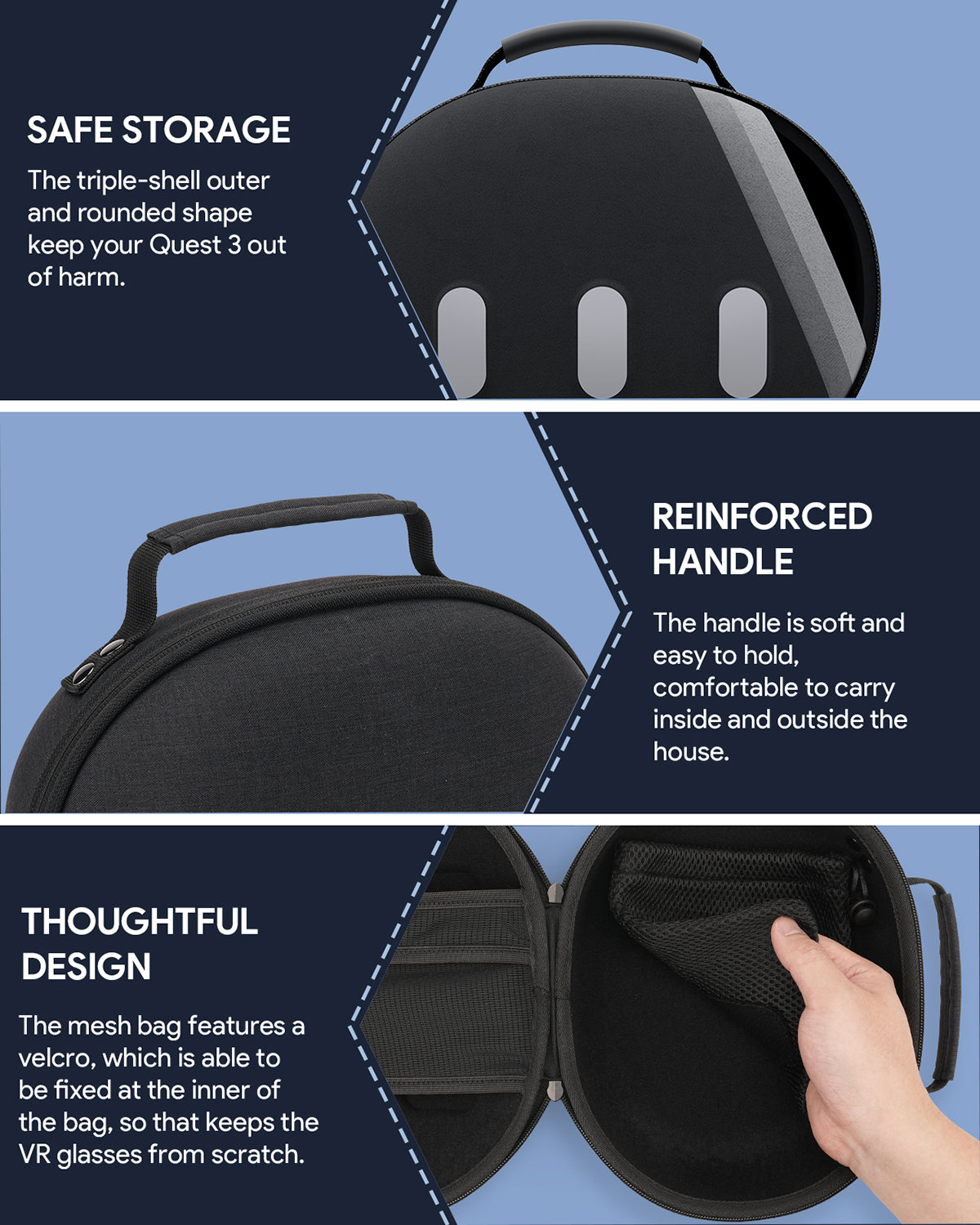 - THOUGHTFUL DESIGN: Featuring an improved dual zipper for easy access to your Meta Quest 3 gear, the EVA shell and internal removable Velcro cushion provide impact resistance and prevent VR devices from shaking, ensuring the utmost security for your valuable equipment.