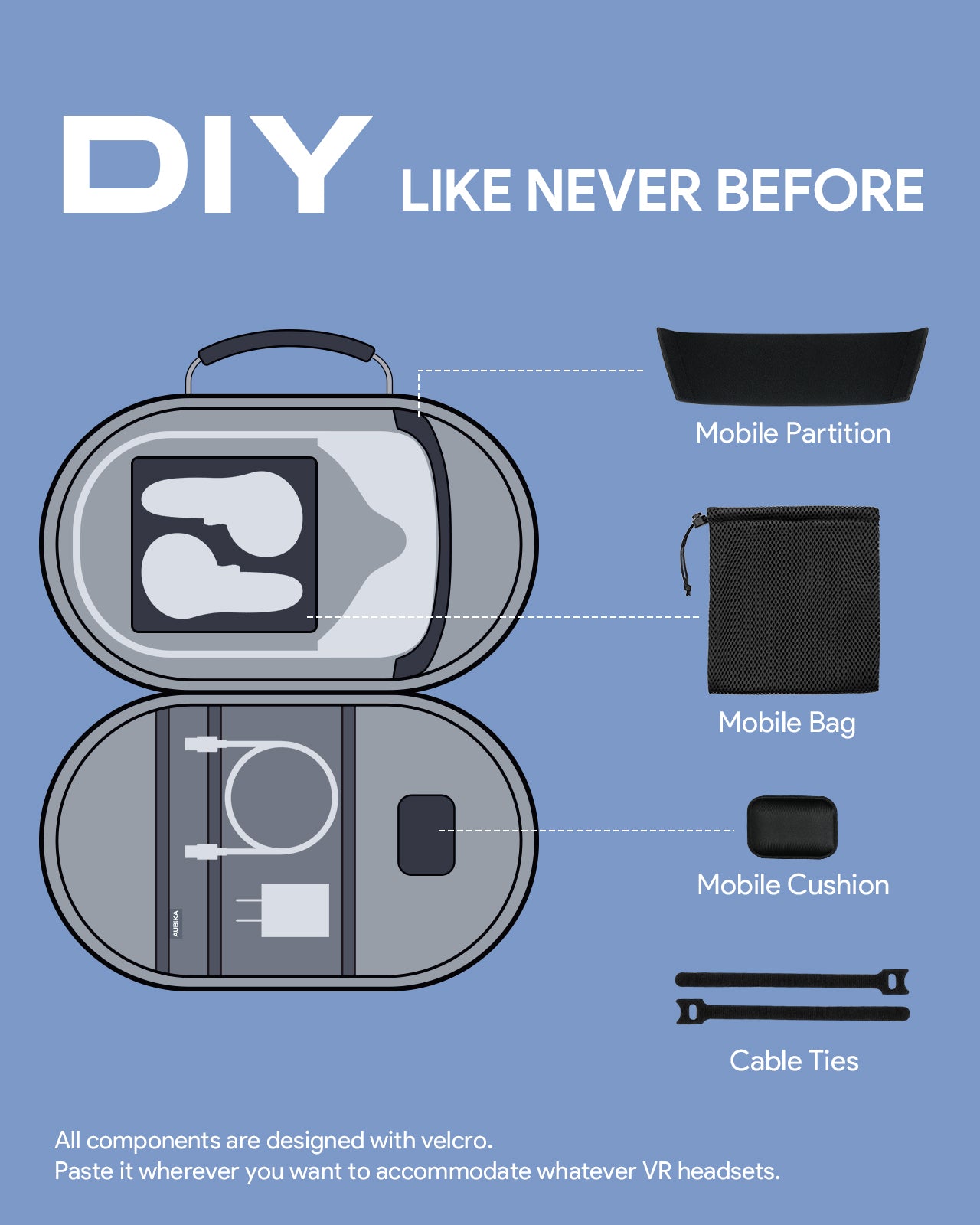 • DIY YOUR VR CASE: The internal removable partition gives you a flexible storage solution. All components are designed with Velcro. You can attach them wherever you want to accommodate any VR headset. We hope to bring you more enjoyment during the DIY process.