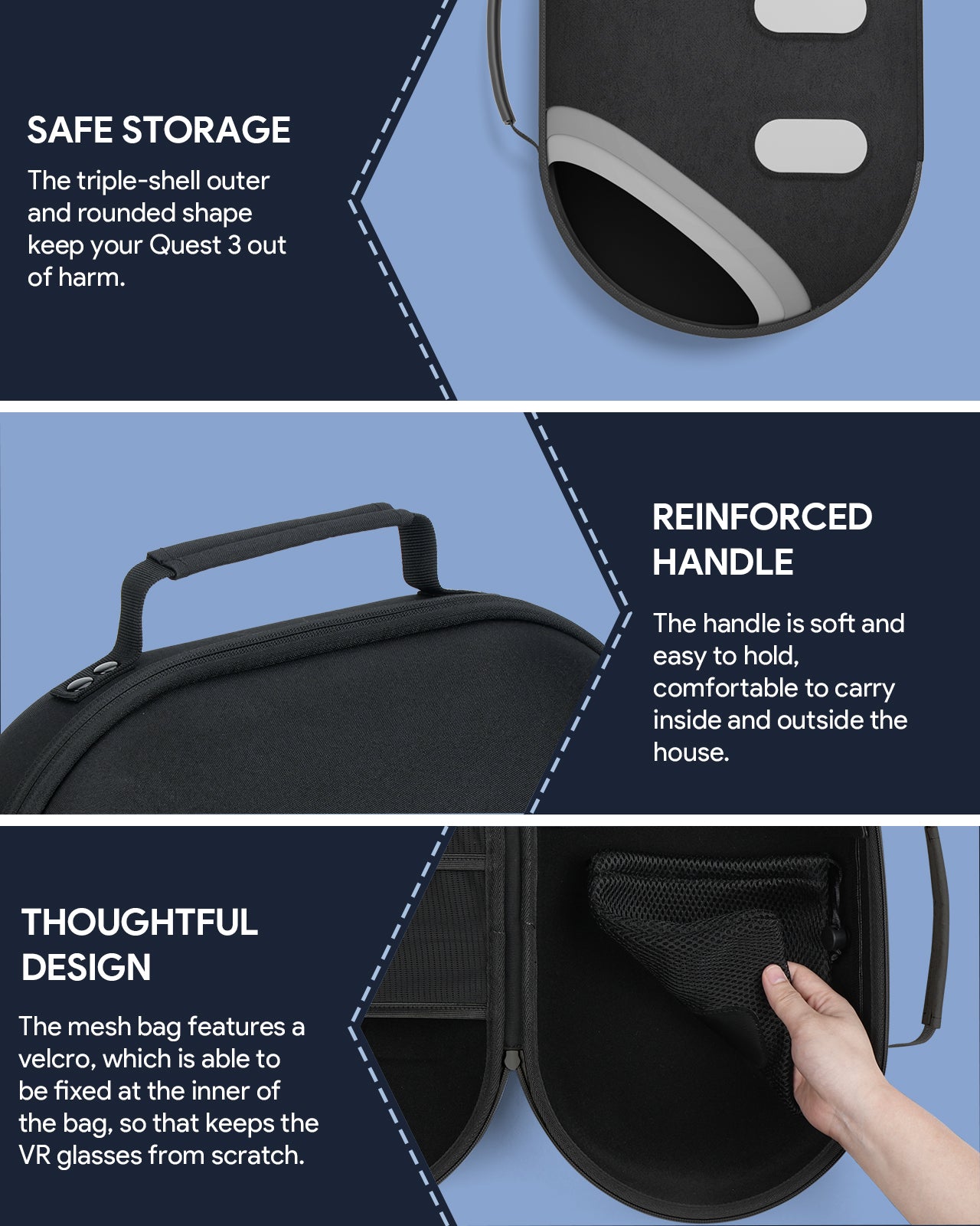 • THOUGHTFUL DESIGN: An improved dual zipper makes it easy to access your Meta Quest 3 gear. The EVA shell and internal removable velcro cushion help to resist impacts and prevent VR devices from shaking, offering great security.