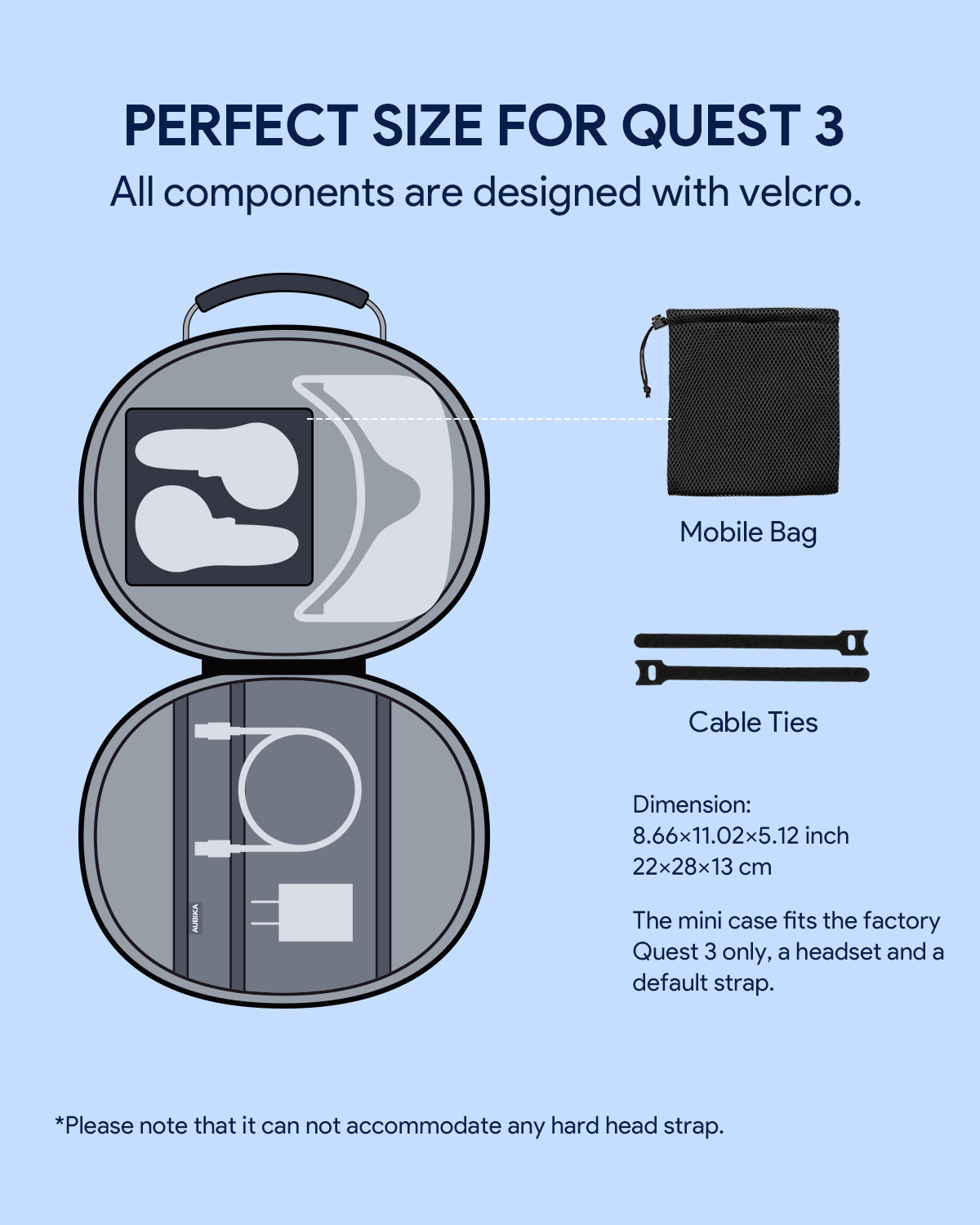 • MINI & PORTABLE: Compact dimensions of 8.66×11.02×5.12 inches (22.00×28.00×13.00 cm) make this case perfect for the factory Quest 3, a headset, and a default strap, ensuring optimal portability. Please note that it does not accommodate any hard head strap.